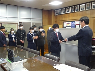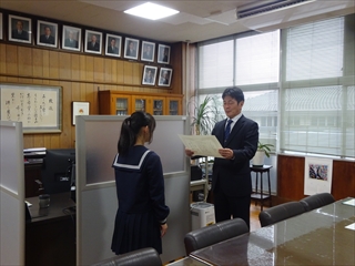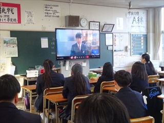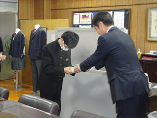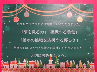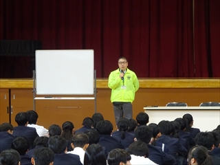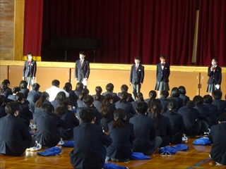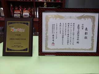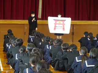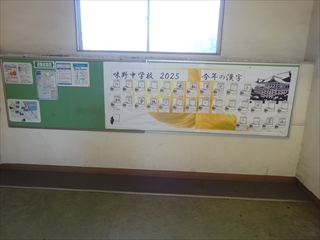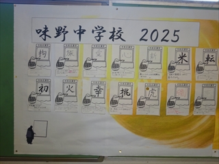 校長室より(学校便り)令和7年度 1学期へ令和7年度 1月20日(火) 倉敷っ子なかよし作品展 1月20日(火)~25日(日)に、倉敷市立美術館で『倉敷っ子なかよし作品展』が開かれています。本校からもI組、J組の生徒の作品を出品しています。味野中の展示ブースは、ポスターや手提げ袋、本棚などの作品があり、なかなか素敵な感じでした。是非、見に行っていただけたらと思います。 1月17日(土) 味野中学区合同防災訓練 青少年を育てる会が主催で、味野中学区合同防災訓練~いざという時は君たちが主役だ!~が行われました。訓練では、段ボールベッドの作成、応急救護体験、初期消火訓練、マンホールトイレの設置、土のうづくりが行われました。最後は、タンクローリーから水を入れ、土のうの効果を確かめました。地域の方、中学生にとって大変有意義な訓練となりました。 ※この様子は、KCTnewsで紹介されます。放送は、1月21日(水)17:00~。 1月13日(火) 受験応援メッセージ いつもの階段途中の掲示板。1月からは、合格祈願。先生方からの受験応援メッセージが掲示されています。いよいよ入試が始まりますね。3年生の皆さん、頑張ってください。先生方は、皆さんの受験を応援しています。 1月7日(水) 3学期始業式 3学期始業式をオンラインで行いました。式の前に、吹奏楽部の表彰。式では、校長先生のお話、生徒代表のお話の後、生徒会から、カバンの変更について説明がありました。3学期は、締めくくりの学期。よい締めくくりができるように頑張りましょう。 12月25日(木) 倉敷こどもミーティング 倉敷こどもミーティングが、市庁舎で開催され、本校からも3人の生徒が参加しました。 今回の協議内容は『誰もが参加しやすいインクルーシブな運動会の種目や車椅子の活用方法を考えよう!』でした。実際に車いすに乗ったり、他の生徒と意見を出し合ったりしながら、各グループで協議していました。 12月25日(木) 感謝状・表彰状の紹介 昨日、表彰披露した中から、学校がいただいたものを紹介します。左から1枚目は、交通安全意識の高揚と交通事故防止に貢献したことによる感謝状。2枚目は、生徒会執行部の善行少年表彰。3枚目は、トンボ1129(いい服)デザインコンクール学校賞です。生徒たちの頑張りが評価され、大変喜ばしいことだと思います。 12月24日(水) 表彰・2学期終業式 表彰、2学期終業式をオンラインで行いました。表彰では、学校や教科、生徒会や部活動、また、多くの個人の頑張りが評価され、大変喜ばしいことだと思います。終業式では、校長の話、生徒会代表の話、生徒指導の話がありました。みなさん、安全で楽しい冬休みを過ごしてください。 12月22日(月) 学年集会 2学期も残り3日となりました。今日は、各学年で学年集会が行われ、各クラスの2学期の反省を学級委員が発表しました。また、3年生は受験に向けた各クラスのスローガンを発表しました。後半には、先生方から冬休み期間中の学習や生活についての話がありました。 12月16日(火) 『緒方洪庵と適塾』の寄贈 中嶋なぎさ様より、『緒方洪庵と適塾』『二十一世紀に生きる君たちへ』を寄贈していただきました。中嶋様は、洪庵六代目になられるそうで、緒方洪庵の人となりや功績を知ってほしいという思いで寄贈していただきました。大切に読みましょう。 12月15日(月) 味野中学校2025 今年の漢字 京都・清水寺で発表された今年の漢字2025は、『熊』でしたね。予想が当たった人も多いのではないでしょうか?さて、先生方の味野中学校2025今年の漢字を北校舎の階段途中に掲示しています。中々興味深いですよ。懇談や授業参観等、来校する機会がありましたら、是非、ご覧ください。 12月12日(金) 人権講演会 今日は、倉敷市人権擁護委員の方にお越しいただき、人権講演会を行いました。講演の中では、グループワーク(人権すごろくトーク)があり、楽しくお題に取り組むことができました。お題は、後半に行くほど高度になっていましたが、友達の意見を聞き拍手する場面が多くありました。講師の方は、「お題に正解はない、大切なのは、考えたことだ」と言われてました。 12月10日(水) 宇宙兄弟全国寄贈プロジェクト(かつおクラブ) かつおクラブの『宇宙兄弟全国寄贈プロジェクト』により、本校に宇宙兄弟全巻(1巻~45巻、46巻は発売され次第届く予定)を寄贈していただきました。「夢を見る力」「挑戦する勇気」「誰かの挑戦を応援する優しさ」を持ってほしいという思いで届けてくださいました。大切に読みましょう。かつおクラブの皆さん、ありがとうございました。 12月6日(土) 人権作品表彰式 味野中学校区人権学習推進員会による人権作品表彰式が本荘公民館でありました。本校から作文、ポスター、標語の部に各1人ずつ最優秀賞が選ばれ、人権作文を会場で紹介しました。作品は、12月10日(水)まで、本荘公民館大会議室に展示されています。 12月5日(金) 学校保健委員会 今年の学校保健委員会では、消防署の方をお招きし、救命救急