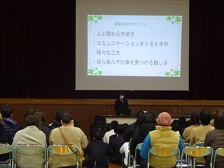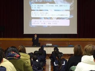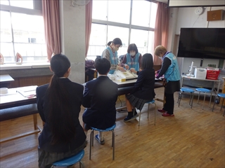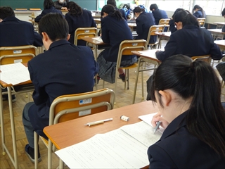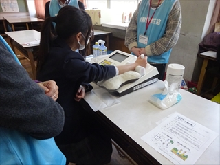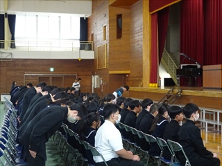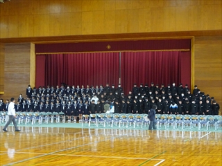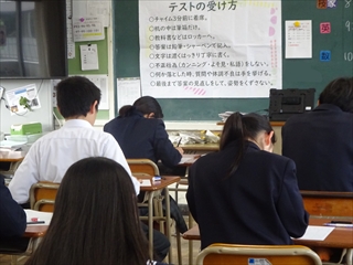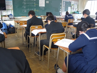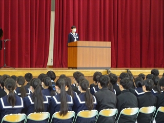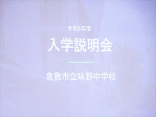 校長室より(学校便り) 令和7年度3学期令和7年度 1学期へ令和7年度 3月11日(水) 3年生環境整備 13日(金)に卒業を迎える3年生たちが、環境整備をしていました。1年間お世話になった3年生教室を綺麗にしていました。机椅子をすべて廊下に出し、普段できないカーテンの洗濯やエアコンのフィルターなど隅々まで綺麗にいしていました。 3月9日(月) 卒業式の練習 3年生が、学校に来るのもあと数日となりました。今日は、3年生最後の給食。給食の後の5時間目は、卒業式の練習を行いました。さすが、3年生きちんとした態度で臨んでいました。明日、明後日は、公立高校の一般入試です。受験する皆さん、頑張ってください。応援しています。 2月26日(木) 学年末考査・直前テスト 1年生・2年生は、学年末考査に臨みました。学年最後の考査ということもあり、生徒たちは最後まで集中して取り組んでいました。3年生は、公立一般入試を目前に控え、直前テストを本番さながらの形式で実施しました。3年生の皆さんが、10日・11日の公立一般入試でこれまでの努力の成果を十分に発揮されることを願っています。 2月12日(木) 骨密度測定(1・2年) 倉敷保健所のご協力をいただき、1・2年生が骨密度測定を行いました。 今回は2種類の装置を使用し、1年生は手、2年生は足で測定しました。 骨を強くするには、「カルシウム」と「ビタミンD・K」を組み合わせて摂ることが大切だそうです。給食で毎日出る牛乳は、まさにぴったりの食品ですね。 2月9日(月) 授業参観・学年懇談(1・2年) 本日、1・2年生の授業参観および学年懇談を行いました。1年生の英語では、生徒の発表に合わせて、保護者の皆様にもスマートフォンで感想を投稿していただきました。2年生は、チャレンジワークの発表会を行いました。学年懇談では、1年生は修学旅行、2年生は進路について説明がありました。ご多用の中、ご来校いただき、ありがとうございました。 2月6日(金) 入学説明会 令和8年度の新入生の保護者を対象に入学説明会を行いました。説明会では、生徒指導担当より、中学校での生活の仕方やきまり等について説明をしました。その後、教頭より各種手続きについて説明しました。お忙しい中、お越しくださった保護者の皆様、ありがとうございました。校支援でのお知らせテスト配信は、17時ごろに行いました。 2月4日(木) 倉敷っ子美術展 ![]() ![]() 1月30日(金)~2月15日(日)に、倉敷市立美術館で『倉敷っ子美術展』が開かれています。本校からも多くの生徒の作品を出品しています。1年生は『自分を表現したマーク』、2年生は『ゼンタングルでスクラッチアート』、3年生は『トリックアート』で、どれも力作です。是非、見に行ってください。 1月29日(木) 児島共同調理場よりオンライン給食時指導 月に1回、児島共同調理場よりオンラインによる給食指導が行われています。今日は、各校からの質問に答えていただく回でした。本校からは、「給食はどのような気持ちで作っていますか」と質問しました。調理場の方からは、「『おいしくなぁれ、おいしくなぁれ』という気持ちで作っています」とのお話がありました。また、3年生からは質問ではなく、「おいしい給食を作ってくれてありがとうございます」と感謝の気持ちを伝えました。 1月25日(日) 鷲羽山ロードレース 鷲羽山ロードレースが行われました。味野中学校からは、陸上競技部と野球部が参加しました。寒さの厳しい中でしたが、生徒たちは最後まであきらめることなく、一生懸命走り抜きました。閉会式では、8位までが表彰され、本校からも数名の生徒が表彰されました。 1月20日(火) 倉敷っ子なかよし作品展 1月20日(火)~25日(日)に、倉敷市立美術館で『倉敷っ子なかよし作品展』が開かれています。本校からもI組、J組の生徒の作品を出品しています。味野中の展示ブースは、ポスターや手提げ袋、本棚などの作品があり、なかなか素敵な感じでした。是非、見に行っていただけたらと思います。 1月17日(土) 味野中学区合同防災訓練 青少年を育てる会が主催で、味野中学区合同防災訓練~いざという時は君たちが主役だ!~が行われました。訓練では、段ボールベッドの作成、応急救護体験、初期消火訓練、マンホールトイレの設置、土のうづくりが行われました。最後は、タンクローリーから水を入れ、土のうの効果を確かめました。地域の方、中学生にとって大変有意義な訓練となりました。 ※この様子は、KCTnewsで紹介されます。放送は、1月21日(水)17:00~。 1月13日(火) 受験応援メッセージ いつもの階段途中の掲示板。1月からは、合格祈願。先生方からの受験応援メッセージが掲示されています。いよいよ入試が始まりますね。3年生の皆さん、頑張ってください。先生方は、皆さんの受験を応援しています。 1月7日(水) 3学期始業式 3学期始業式をオンラインで行いました。式の前に、吹奏楽部の表彰。式では、校長先生のお話、生徒代表のお話の後、生徒会から、カバンの変更について説明があり
