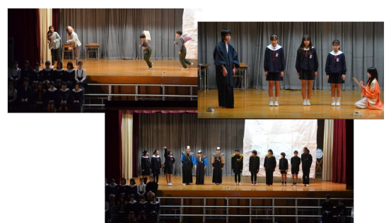 6年生 社会の学習での学びを生かし、「タイムトラベル」という劇を行いました。
