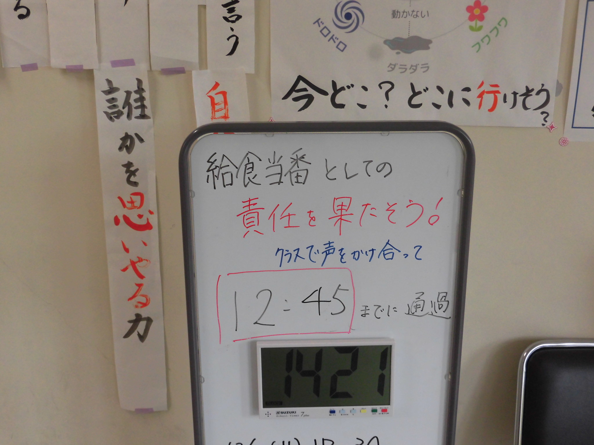 先週は、給食の準備に課題が残る1週間でした。全校の目標は、4時間目が終わって5分後の「12時45分までに、校長室前を通過する」です。先週はなんと、4日間とも、達成できず、どこかのクラスが、45分を過ぎてから通過していました。担任の先生発信で、各クラスにこの現状を伝えたところ、今週は、昨日、今日と2日続けてパーフェクトが出ています。あと1日、明日もパーフェクトなるか??頑張りどころです・・・!クラスで協力して、さっさと準備をしてゆっくり給食を食べる時間が取れるといいなと思います。