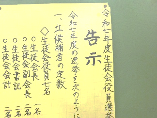 生徒会役員選挙の、立候補者が出そろいました。7名の執行委員のところに、8名の立候補者がありました。学校のために頑張ろう、という思いを持った立候補者たち。とても頼もしく思います。投票する人は、仲良しだから、という理由だけではなく、これからの選挙運動期間で、一人一人の意見をしっかり聞いた上で、責任をもって投票してほしいと思います。