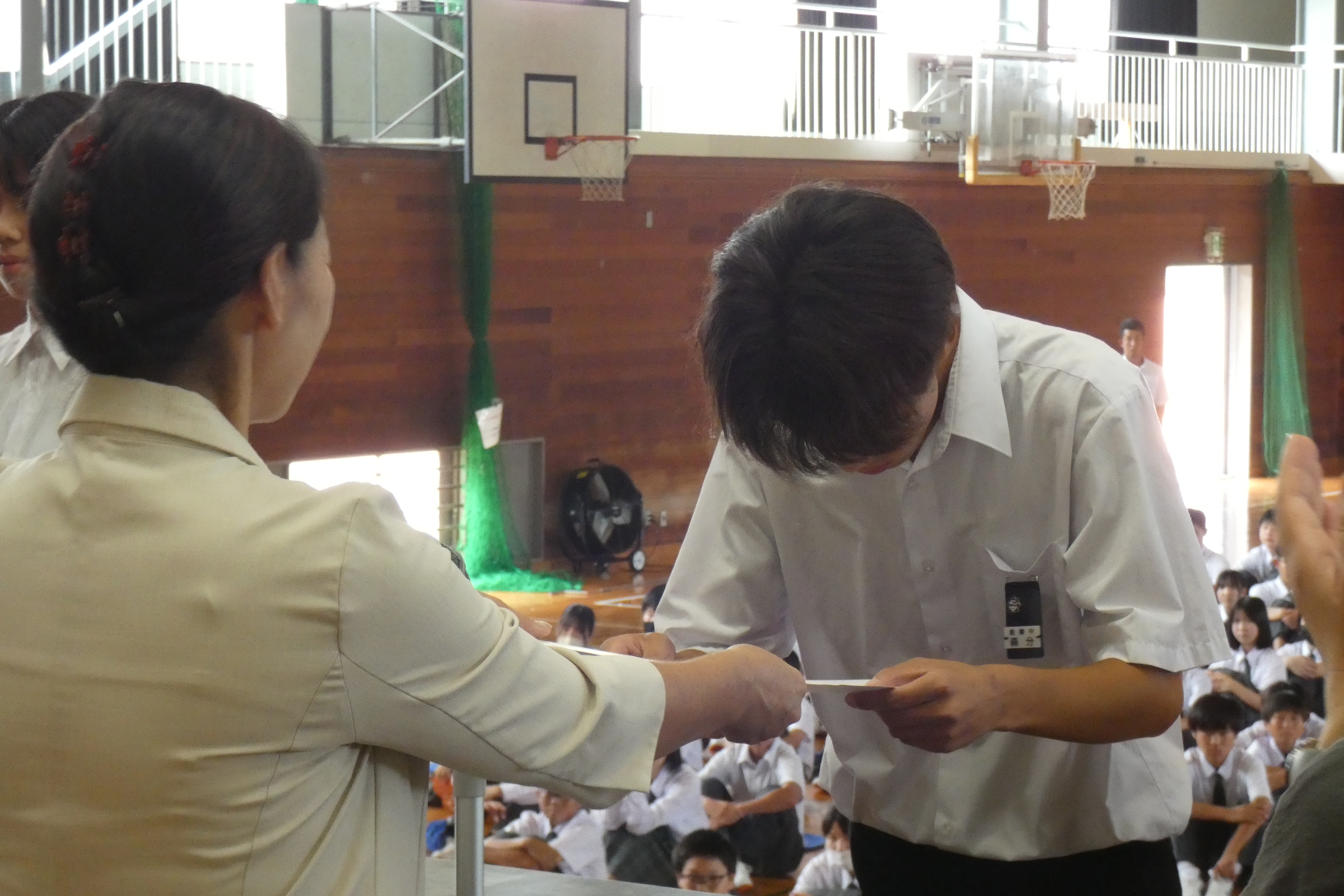 2学期の始業式でした。1学期の終業式で約束した通り、夏休み中に大きなけがや事故なく過ごすことができて、とてもうれしく思います。始業式に先立ち、夏休み中に様々な大会やコンクールなどで活躍した生徒の表彰を行いました。