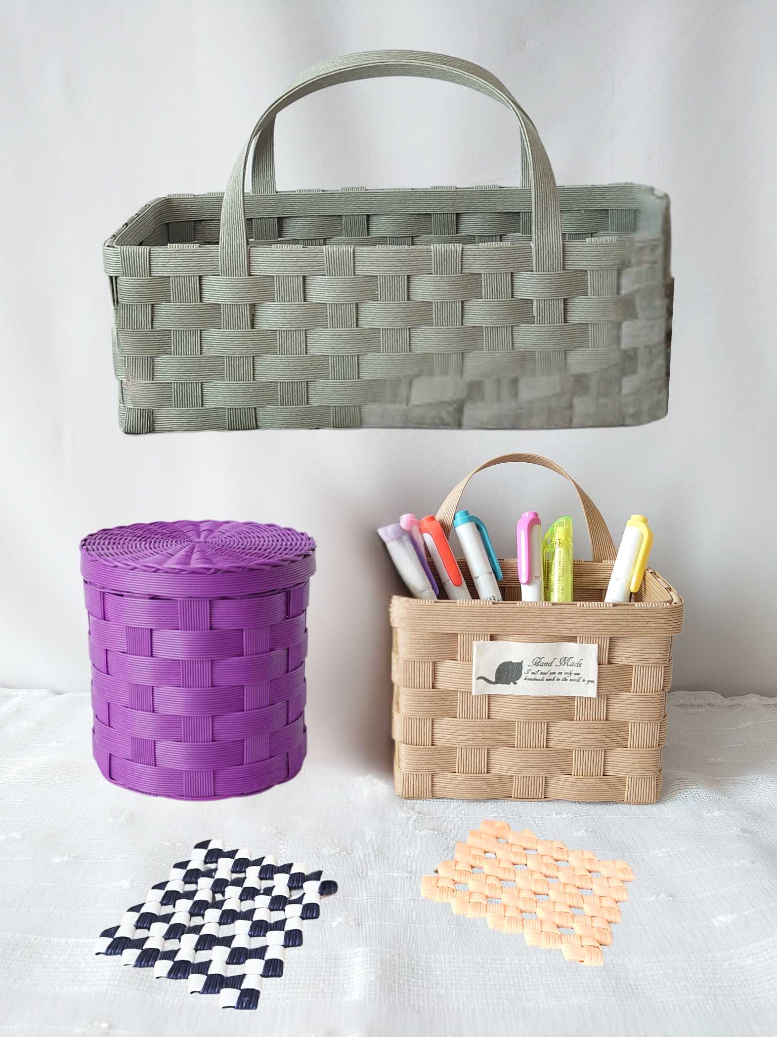 | 環境にやさしい再生紙を使ったクラフトバンドで実用的なカゴや小物・バッグを作ります。クラフトバンドの基本的な編み方を学びましょう。 |