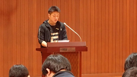 4月11日(木)、新入生と在校生(2~4年生)との対面式が行われました。生徒会長から新入生を歓迎する言葉が伝えられ、新入生の代表からは抱負が語られました。