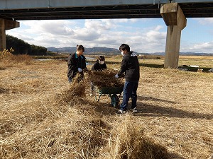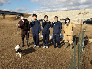 12月18日 13時半からまび復興ドッグランで園芸部3名がボランティア活動をしました。活動内容は、刈り取った草の掃除と水たまりができる場所を土で埋める作業です。地域の方も参加されていて一緒に作業することができ、とても貴重な経験になりました。