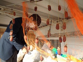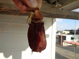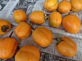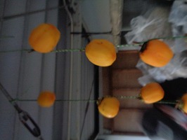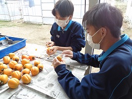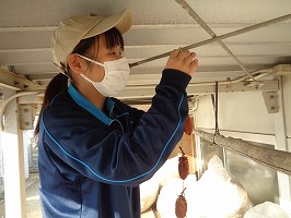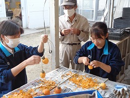 10月24日園芸部で干し柿を作りました。西条柿という味が格別な美味しい柿の皮を抜き湯通しして、食用アルコールもかけて農場倉庫上に干しました。