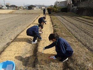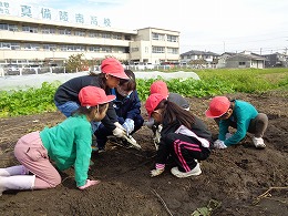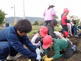 11月4日(金)の1・2限に、2年生の農業選択者4名が、箭田小学校1年生33名を招いて、「サツマイモ収穫体験」を行いました。今年も天気に恵まれ、小学生と楽しくサツマイモ掘りをすることができました。