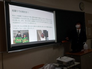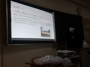 1年間お疲れさまでした。課題研究を通して自分で調べて自分の思い・考えを形にしていくことができるようになってきていると感じました。卒業後も、それぞれの進んだ道で頑張ってください!
