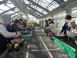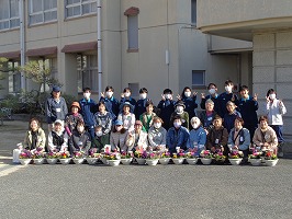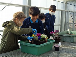 3修3年生の草花選択者7名が先生役となって、地域の方々8名に向けて寄せ植え講座を実施しました。最初は緊張気味の様子でしたが、寄せ植えを通して、地域の方々の笑顔ときれいに仕上がった寄せ植えを見て、大満足そうに喜んでいました。寄せ植え終了後には、「人と接することが苦手だと思っていたけど、この授業でコミュニケーション能力を育成できた!!」と話す生徒もいました。お忙しいところ、ご参加いただきました皆様、本当にありがとうございました。また、参加できなかった地域の方には、大変申し訳ございませんでした。どうぞ来年もよろしくお願いいたします。