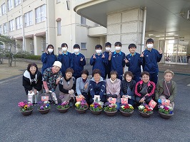 6月19日(木)の昼休みに、箭田幼稚園・箭田小学校・真備中学校・箭田地区まちづくり推進協議会の方をお招きして、花の苗贈呈式を行いました。生徒が大切に育てた苗を、地域の方々に手渡しました。地域の方々の喜ぶ笑顔を見ることができ、たくさんの交流もある良い贈呈式となりました。