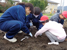 「(サツマイモが)掘れた!!」・「ミミズもいた!」と言う小学生の楽しそうな姿と、「(サツマイモ)ここにもあるよ!」と教えてあげる陵南生の優しい姿が印象的でした。