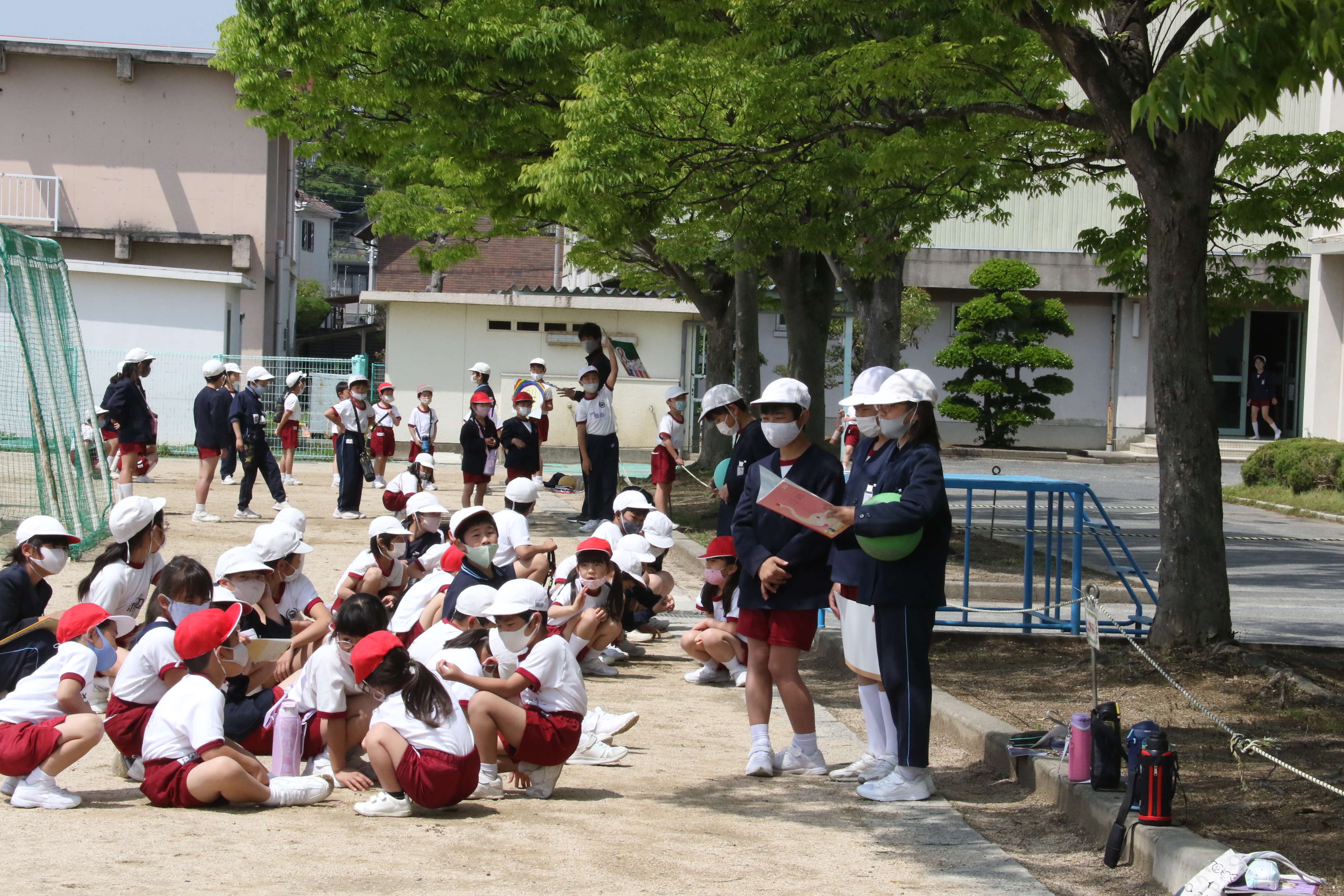 | 1年生から6年生までの混合班(縦割り班)で行うなかま班活動では、1年間、助け合いながら掃除や、集団遊びなどをします。今日は6年生がリーダーシップをとって、なかま班で自己紹介をしたのち、ゲームをして交流しました。 |