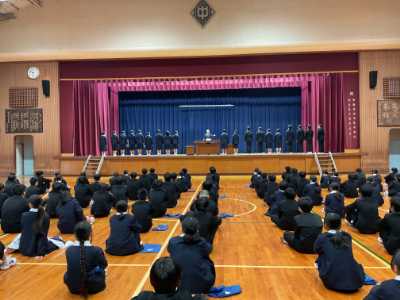 あっという間に2学期の終業式の日が来ました。体育館で表彰と終業式が行われました。今日は朝から曇天で下校の頃には雨が降り出しました。が、下校時の生徒の皆さんは2学期をやりきった清々しい顔で「良いお年を!」とあいさつをしてくれました。明日から13日間の冬休みをよく学び、よく遊び、充実した時間にしてほしいと思います。また始業式に元気な姿で会いましょう!