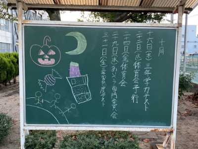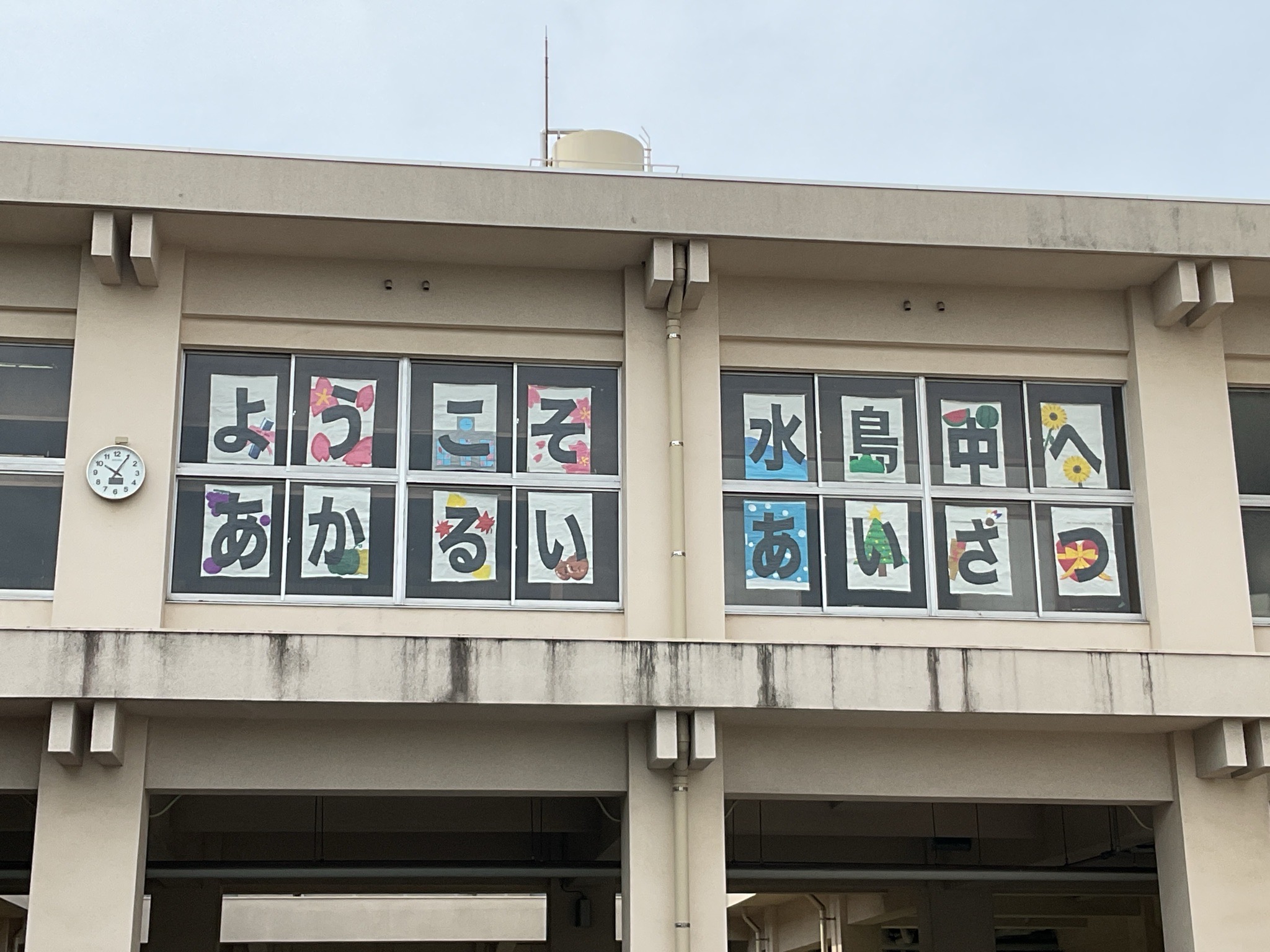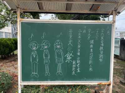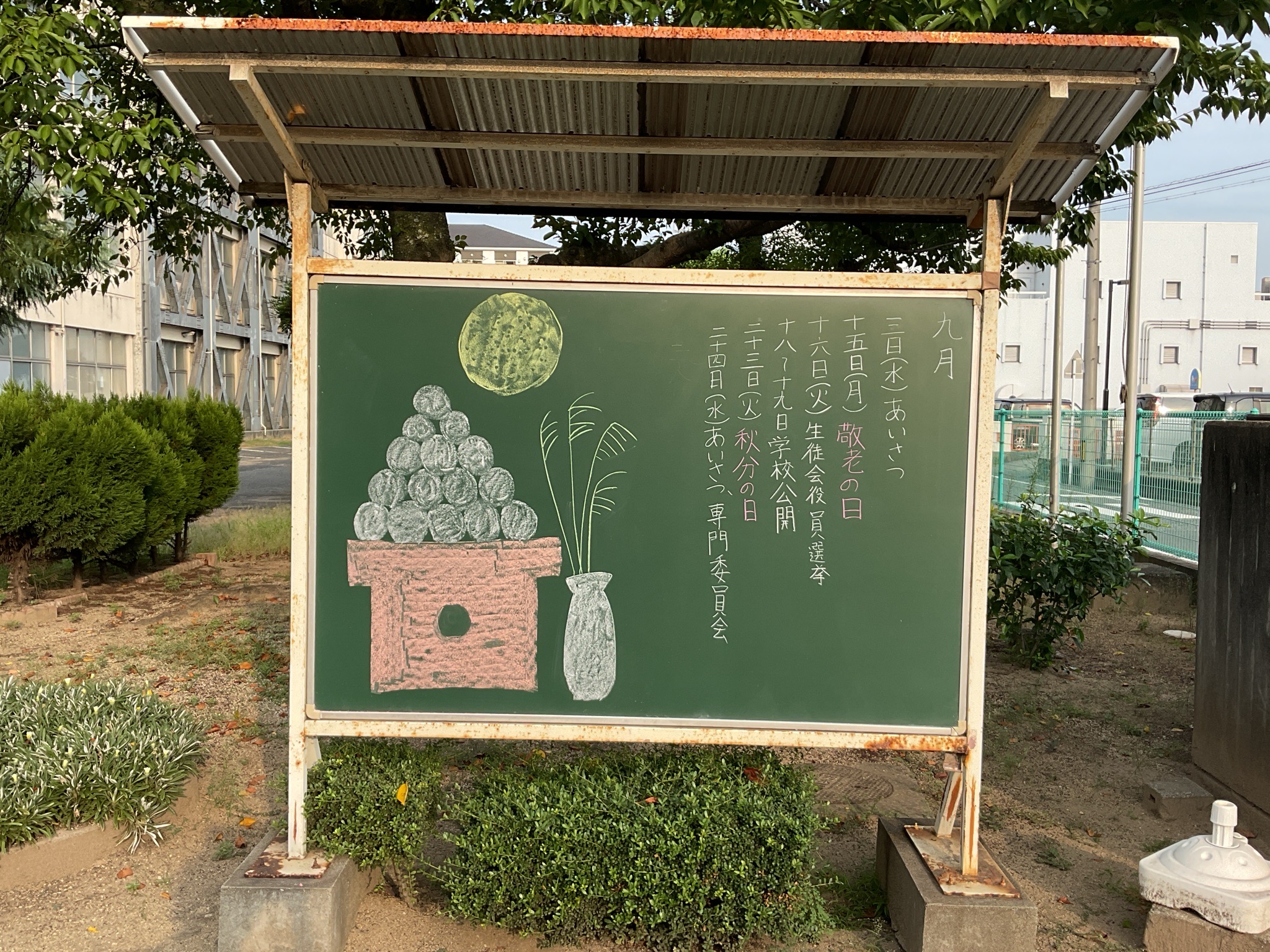 まだまだ暑い日が続きますが、校門の掲示板が新しく秋バージョンになっていました。また、外から見える「ようこそ水島中へ あかるいあいさつ」のポスターを美術部が夏休みに作ってくれました。学校の雰囲気も明るくなり、きっとあいさつの声もますます大きくなることでしょう。