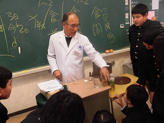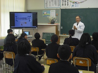 再び学校薬剤師の先生に来ていただいて,出前授業を行いました。今回は,薬物についての学習をしました。危険な薬物だけでなく,普段私たちが調子が悪いときに使っている市販薬でも,使い方を間違えると大変危険なことになるということを,実験を交えながら分かりやすく教えていただきました。 |