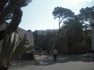 地域の方のご協力を得て,玄関前の大木を伐採していただきました。木が傾いていた上,大きくて手入れができない木でしたが,地域の方のおかげで切り倒すことができました。玄関前がさらに明るくなり,安全になりました。 |