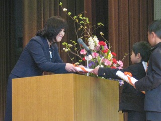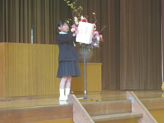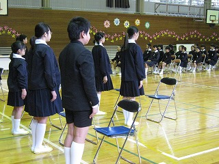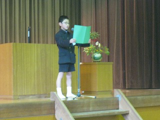 平成27年度の修了式がありました。各学年の代表の人が,校長先生から修了証を受け取りました。その後,校長先生から5つの大好きの振り返りのお話がありました。この1年で,子どもたちは心も体も大きく成長し,次の学年への期待を大きく膨らませているようでした。 その後,今年度で転退職される先生方とのお別れの式がありました。お別れするのは寂しいですが,これまで教えていただいたことを心にとめて,がんばっていこうと思いました。 |