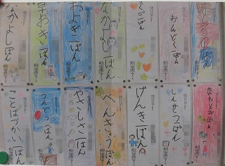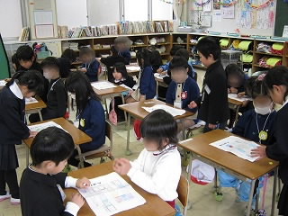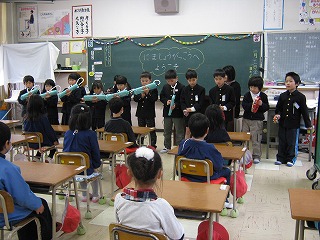 4月から1年生になる園児を迎えての一日入学がありました。1年生にとっては初めてのお兄さん・お姉さん役です。キラキラ星の合奏をしたり,たぬきの糸車の紙芝居をしたり,一緒にすごろくをしたりして,小学校の楽しさを伝えることができました。園児も,いろいろな体験ができ,プレゼントももらえたので,とてもうれしそうでした。 | |