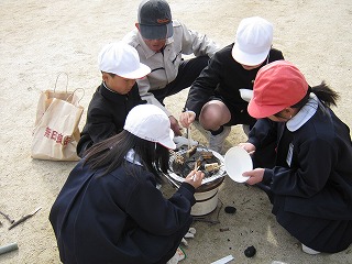3年生は,社会科で「昔の道具と人々のくらし」という学習をしています。今日は七輪を使って火を起こし,おもちを焼いて食べました。 地域の方に火のつけ方や七輪を使ったおもちの焼き方を教えていただいたので,とてもうまくできました。 七輪を使って焼いたおもちはとてもおいしくて,ほっぺたが落ちそうでした。 |