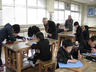 4年生は,図工で木版画の学習をします。初めて彫刻刀を使うので,今日は地域の学習支援ボランティアの先生に来ていただいて,正しく安全な彫刻刀の使い方を教えていただきました。 彫刻刀の種類によって,版木を彫った後の削れた形がちがうのに驚きながら,動物や花をモチーフに自分が創造したものを彫っていきました。 |