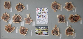 先日から制作に取り組んできた卒業制作が完成しました。しっかり磨き上げピカピカになった板に,自分の好きな漢字を毛筆で一文字書いて仕上げました。一人ひとり,ちがった形ちがった模様で,どれもすばらしい仕上がりです。卒業にふさわしいいい記念ができました。 |