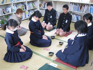 6年生は,地域の方に来ていただいて,お茶のお点前の学習をしました。初めての児童,また幼稚園のころ経験した児童も6年ぶりということで,いろいろな作法や道具に興味津々で学習できました。お互いにお茶を出し合ったり,先生方に出したりして,普段の生活では味わえない礼儀作法に新鮮さと程よい緊張感を覚えました。 |