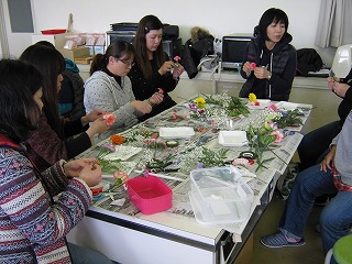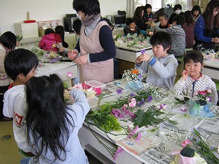 PTA主催の研修講座を行いました。今年は,コサージュ作りとフラワーアレンジメントを行いました。たくさんの保護者や子どもたちが参加しました。講師の先生に教えていただいたり,お互いに見合ったりしながら,各自思い思いの花を選んで,素敵なコサージュやフラワーアレンジメントを作ることができました。 |