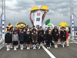 真備・船穂地区が倉敷市の合併して10年となるのを契機に建設された「倉敷大橋」の開通式がありました。 多くの地域住民や関係者が見守る中,真備・船穂地区等の小学校から代表児童が参加し,くす玉割りを行って,橋の渡り初めをしました。 二万小学校からも,学芸会の出演を終えた5年生児童2名が参加しました。 この冬一番の寒波がやってきているので,橋の上は寒かったですが,「これから買い物に行くのが便利になるね。」などと話しながら、しっかりと歩くことができました。 |