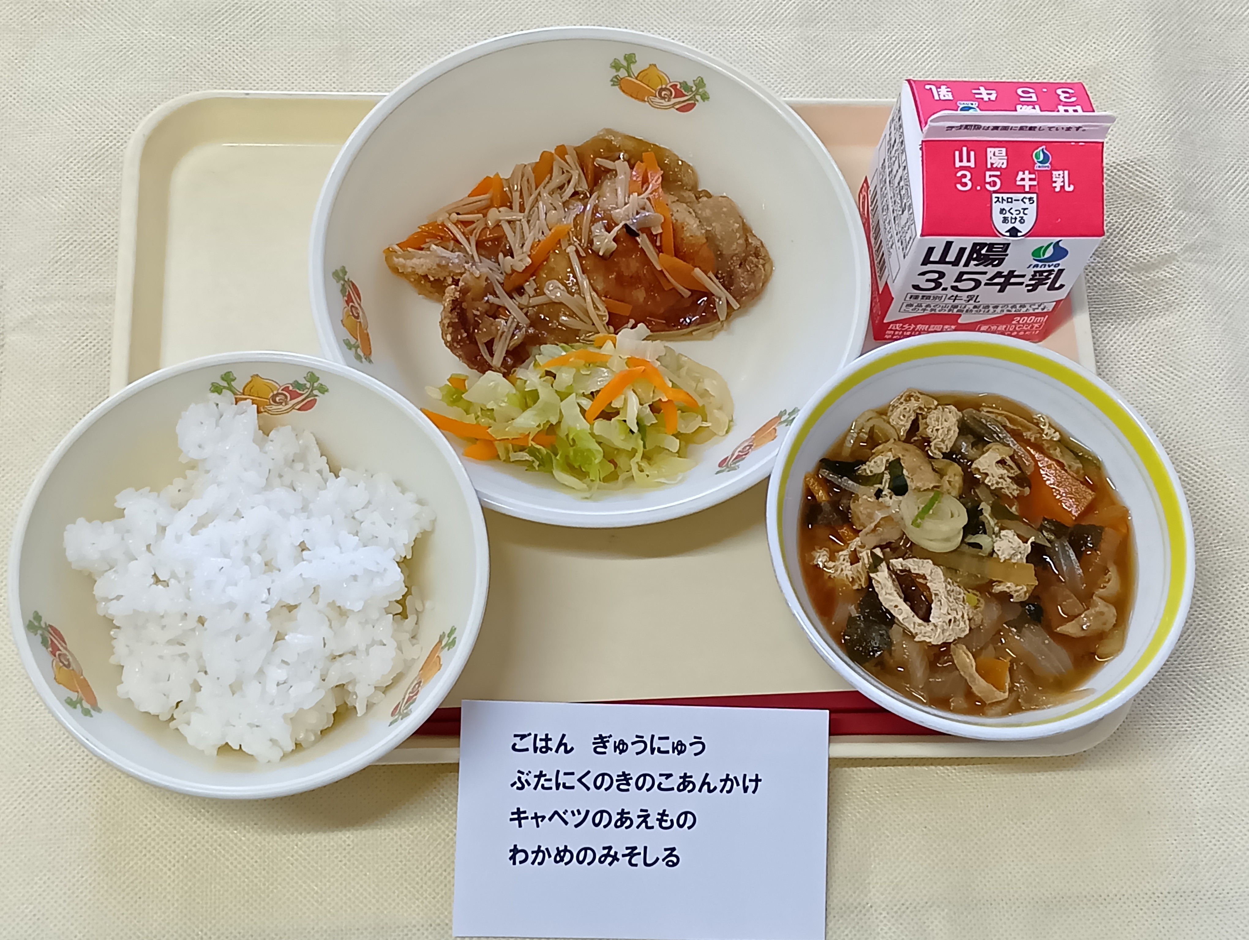| 10 | (月) | ごはん 牛乳 豚肉のきのこあんかけ キャベツのあえ物 わかめのみそ汁 | ||||||||