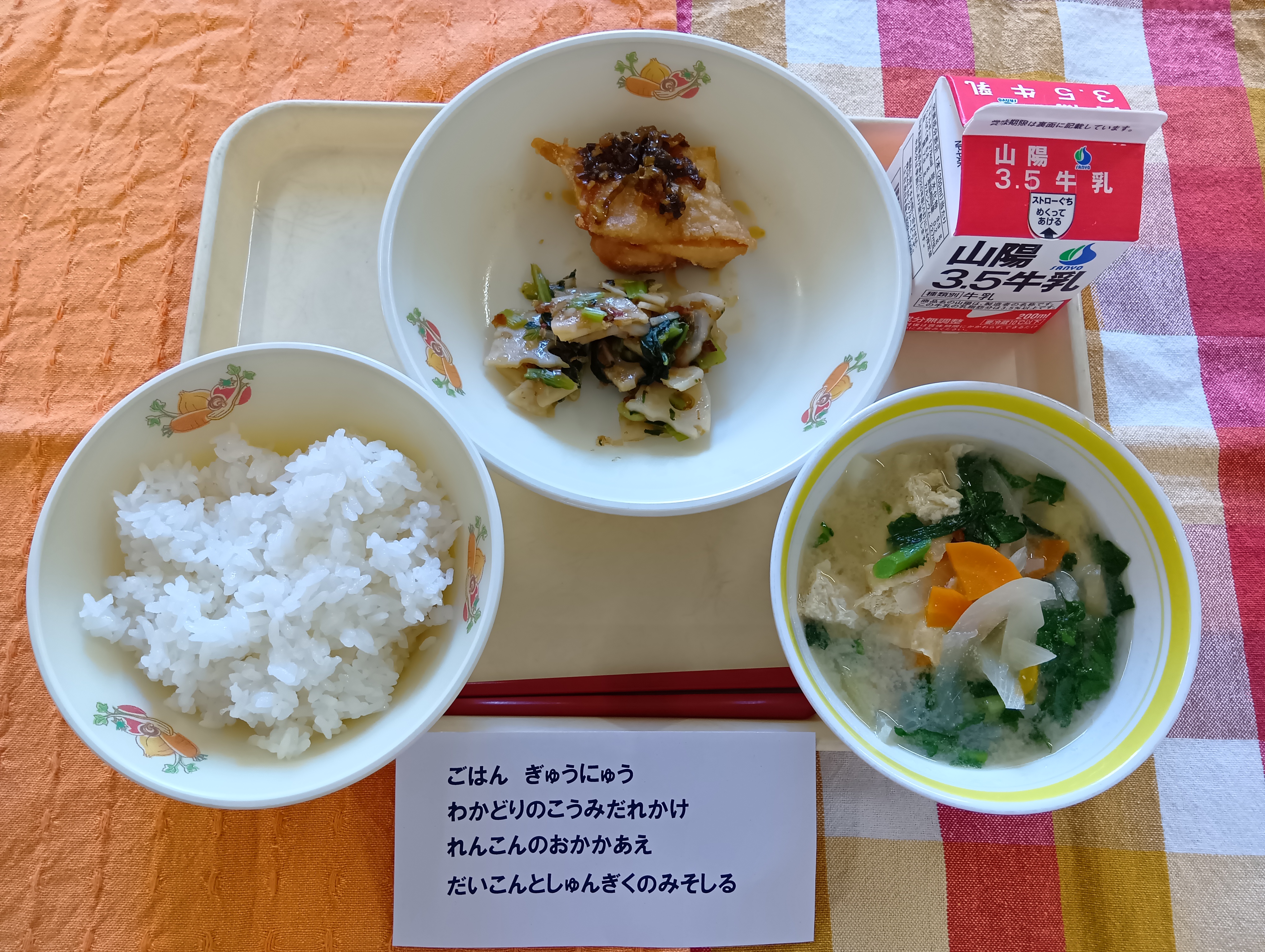 | 28 | (金) | ごはん 牛乳 若鶏の香味だれかけ れんこんのおかかあえ 大根と春菊のみそ汁 | ||||||||