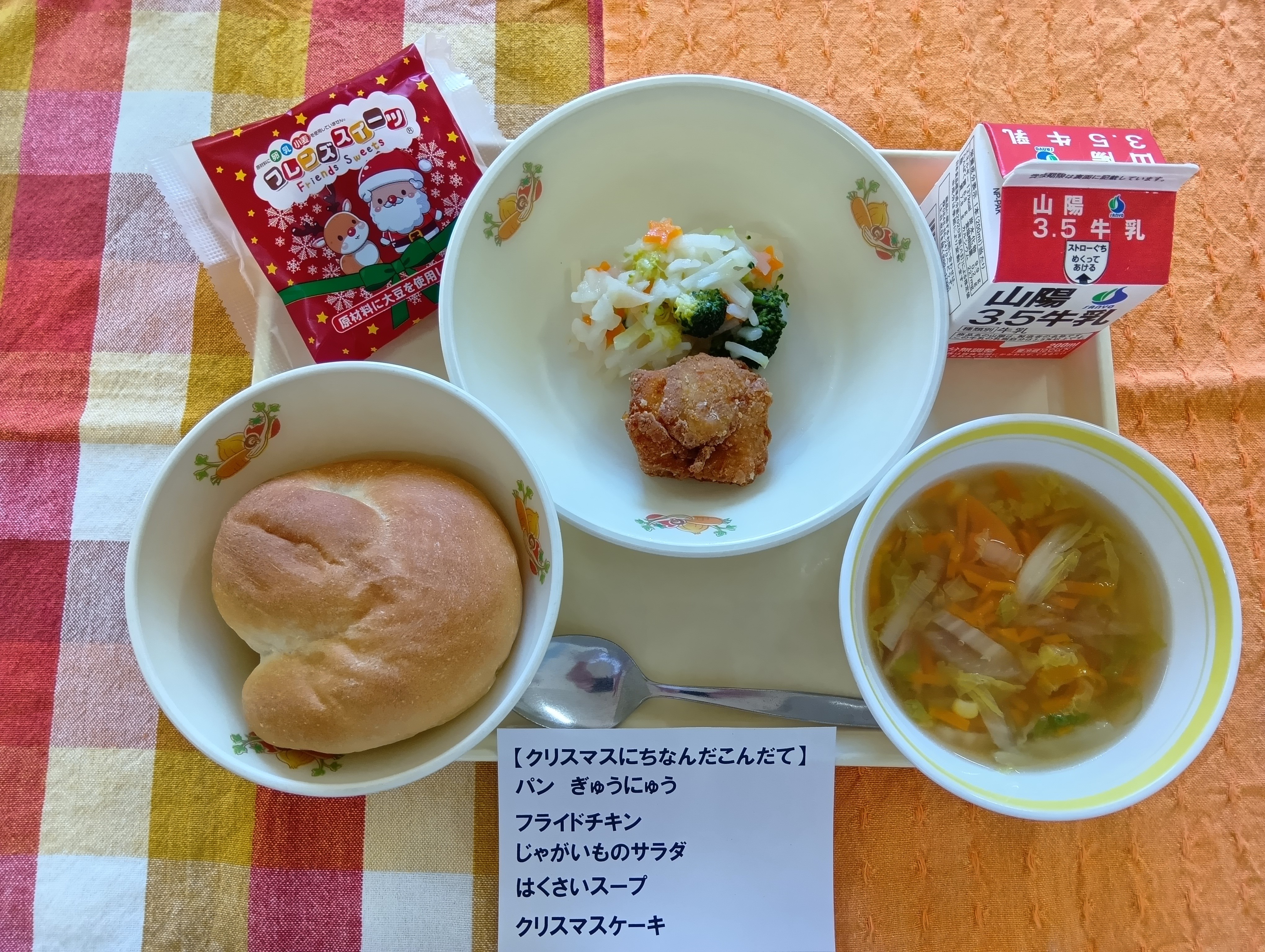 パン 牛乳 フライドチキン じゃがいものサラダ はくさいスープ クリスマスケーキ