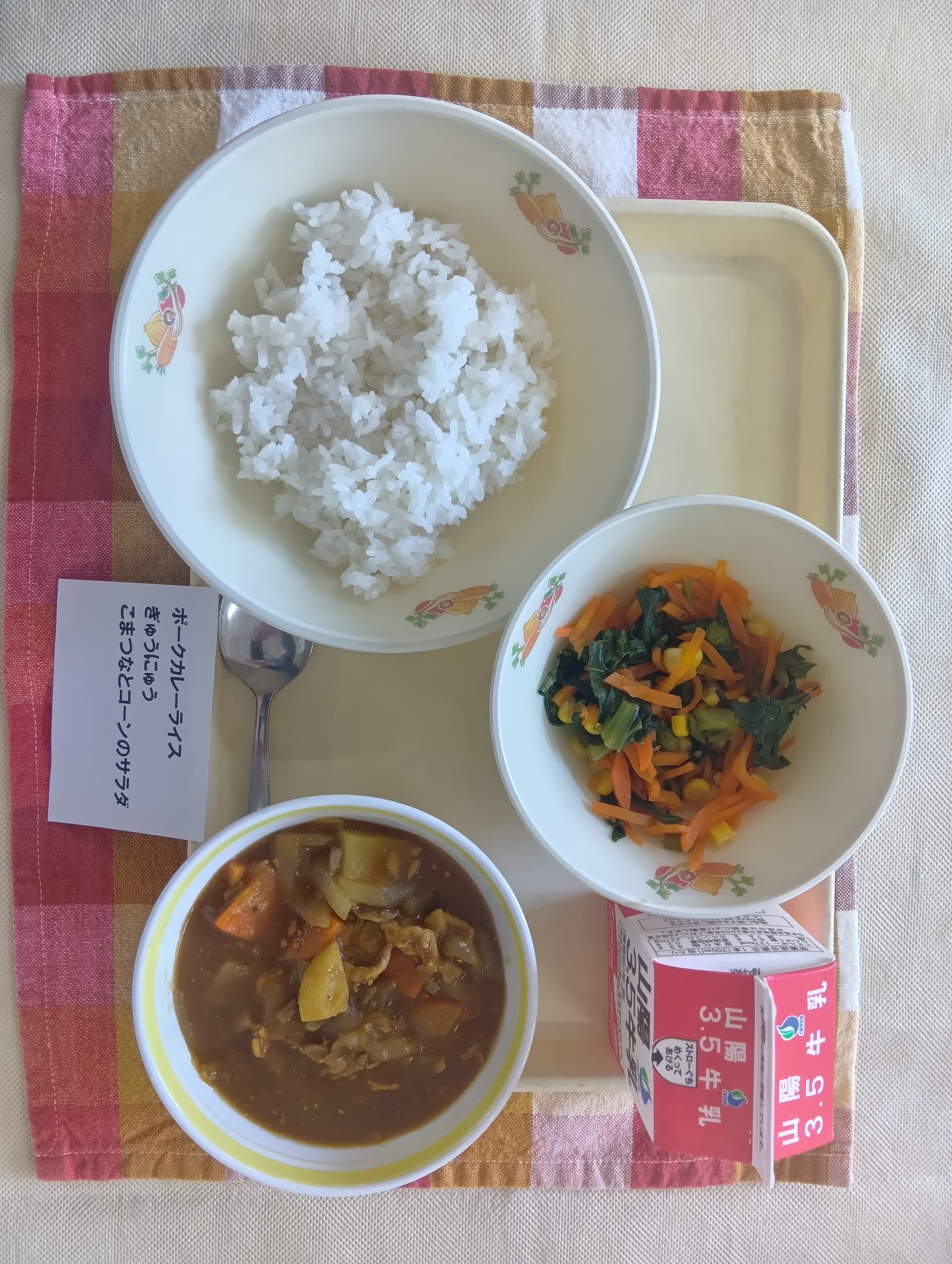 ポークカレーライス 牛乳 小松菜とコーンのサラダ