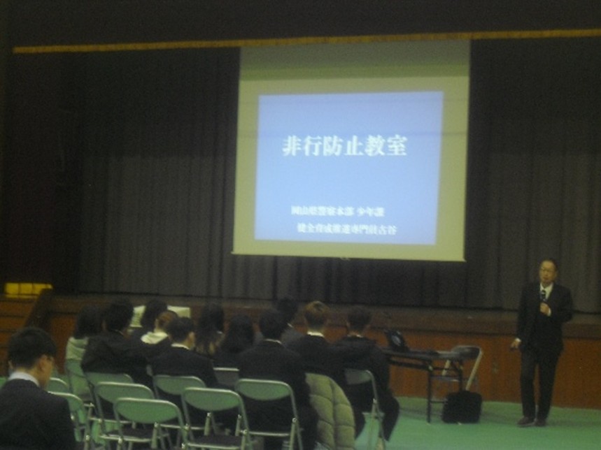 12月24日(水)、全校集会の後に非行防止教室が行われました。岡山県警察本部生活安全部少年課健全育成推進員から古谷様をお招きしての講演でした。高校生に多い犯罪や、巻き込まれやすい事件といった身近な事例が紹介されました。最近では闇バイトをはじめとしたSNSを介した犯罪やトラブルが増えています。生徒にとっても関係ない話ではなくなってきているので、これを機にSNSの使い方を考えてみましょう。