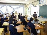 今年も学校支援として中学校の玄関にお花を生けてくださっている小野和代先生による道徳授業を、3年生4クラスで11月13日(水)より行いました。本校の卒業生でもある小野先生から、生け花を通して地域に恩返しをしているというお話、また今夏整備を行った中庭の設置にも当時PTA役員としてご尽力くださったお話などに、生徒は熱心に聞き入っていました。地域の行事や交通の見守り等で地域の方にお世話になることの多い庄地区ですが、こうして地域を愛する方や地域の子どもを応援してくださる方の存在を知り、大人になってからも郷土を大切に思う心を持ち続けてほしいと思います。