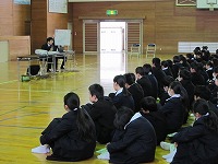 続いて全校集会では、生徒指導の先生から、11月から冬服に移行するにあたり学生服の下はカッター・ブラウス、セーター等の防寒着は着てもよいが、袖口や裾から出ないようにする等の注意がありました。