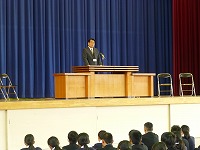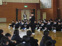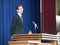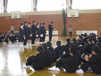 4月12日(金)昨日の入学式に引き続き、上級生との対面式、部活動紹介を行いました。各専門委員長から委員会の説明があり、「やる気のある人は立候補してください。」と呼びかけがありました。お祝いとして、各クラスにお道具箱が贈られました。新入生代表の生徒がお礼の言葉を述べました。