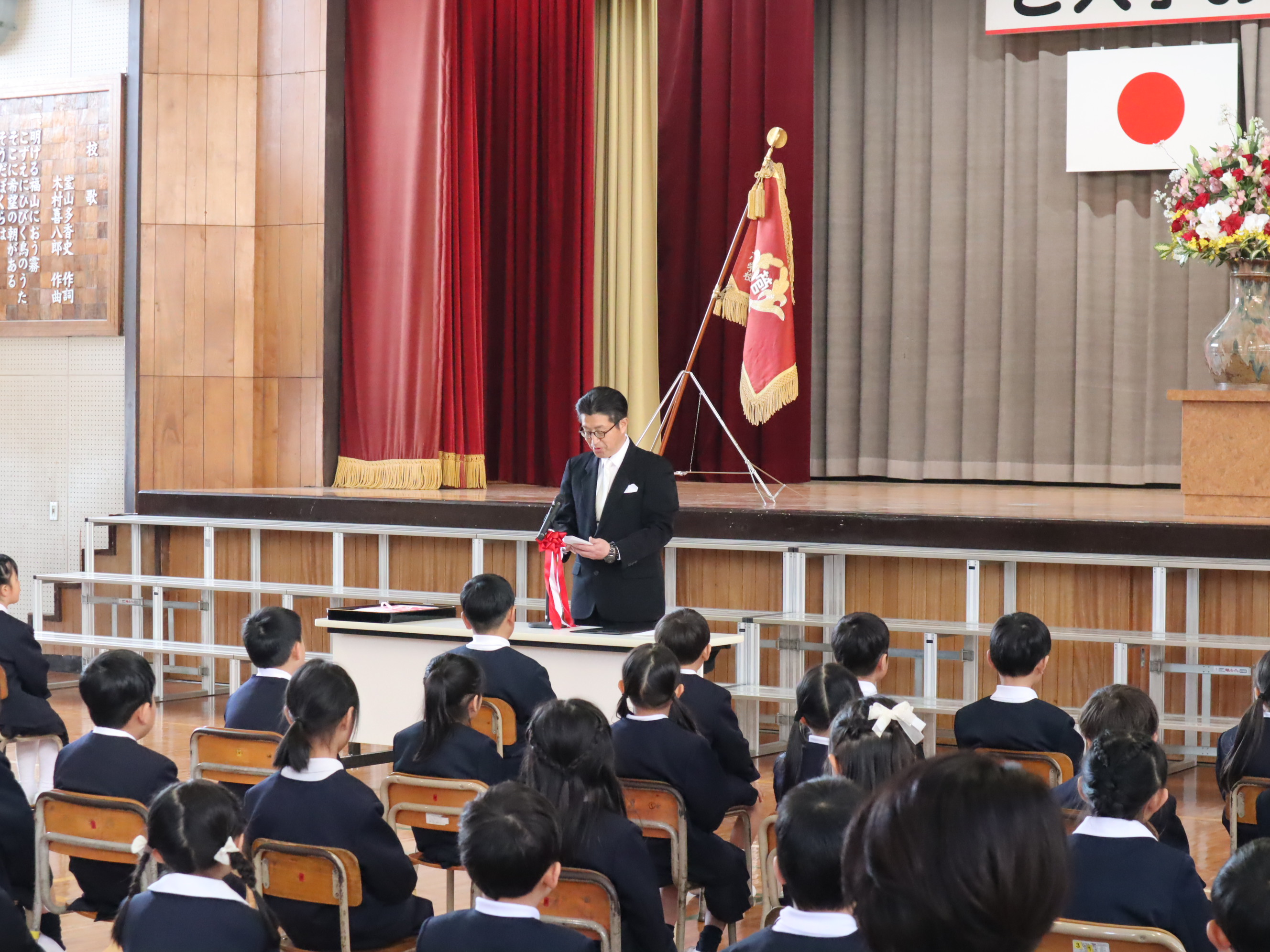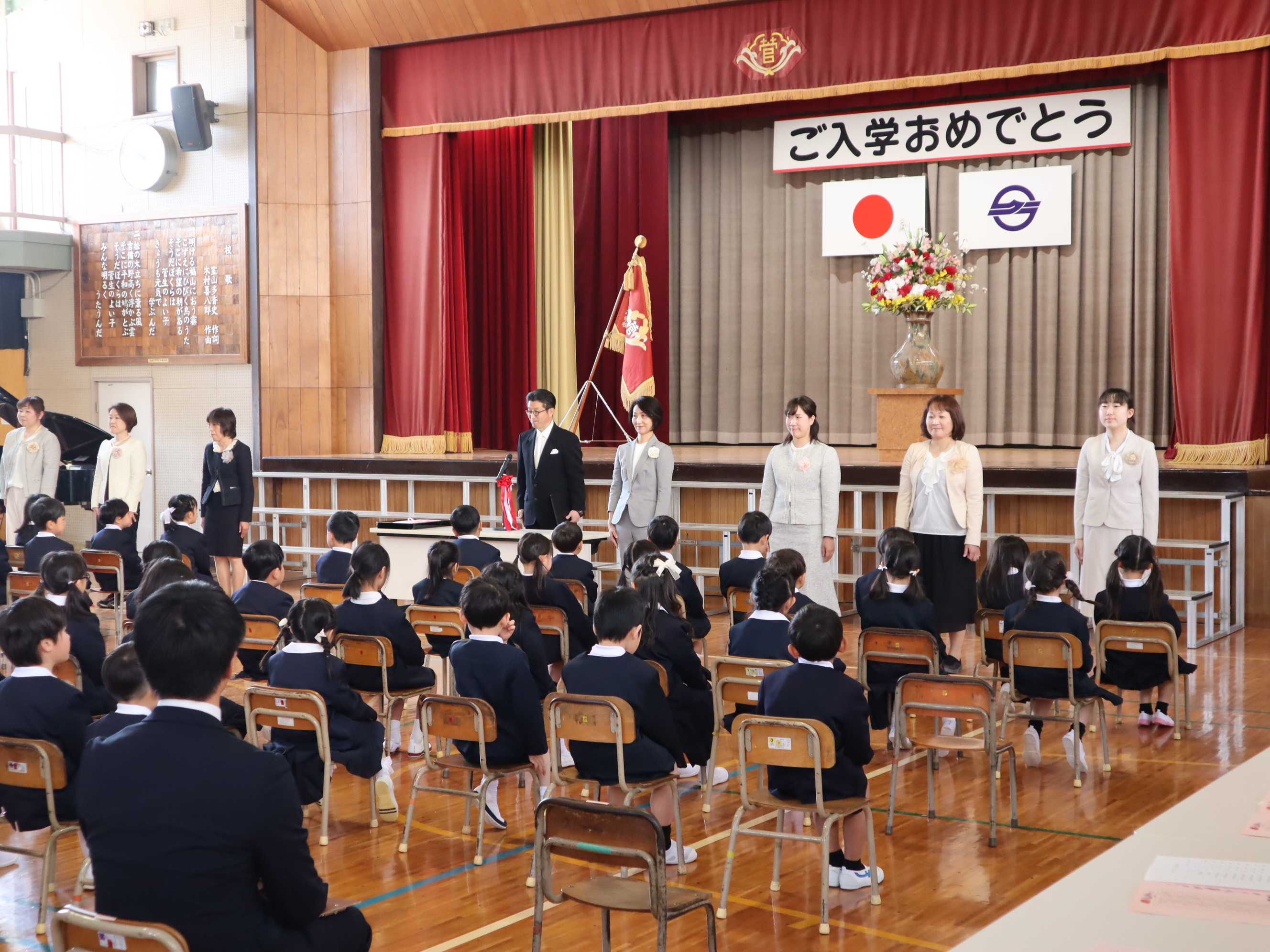 4月9日(水)、令和7年度入学式を行いました。桜の開花と重なって、ちょうど入学式の日は、満開でした。花々に迎えられ、春らしい晴天の中、73名の新入生が元気に入学しました。今年は6年生と一緒に入場し、これからの学校生活にドキドキしているようでした。