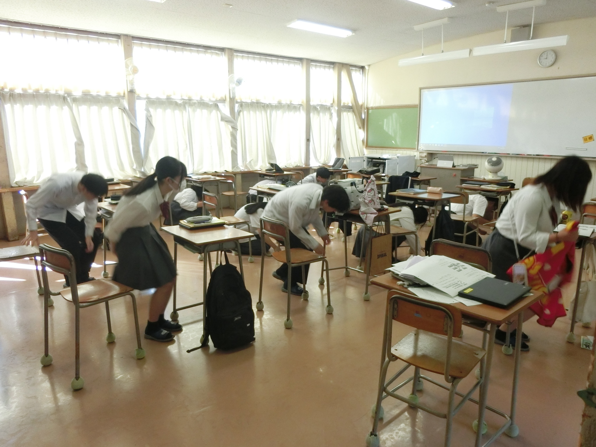 9月26日(木)に地震対応訓練がありました。事前に生徒連絡はしておらず、抜き打ちでの訓練でしたが、みんな机の中にもぐり、命を守る行動をとることが出来ました。2階にいる場合と1階にいる場合の避難方法をそれぞれ再確認することが出来ました。