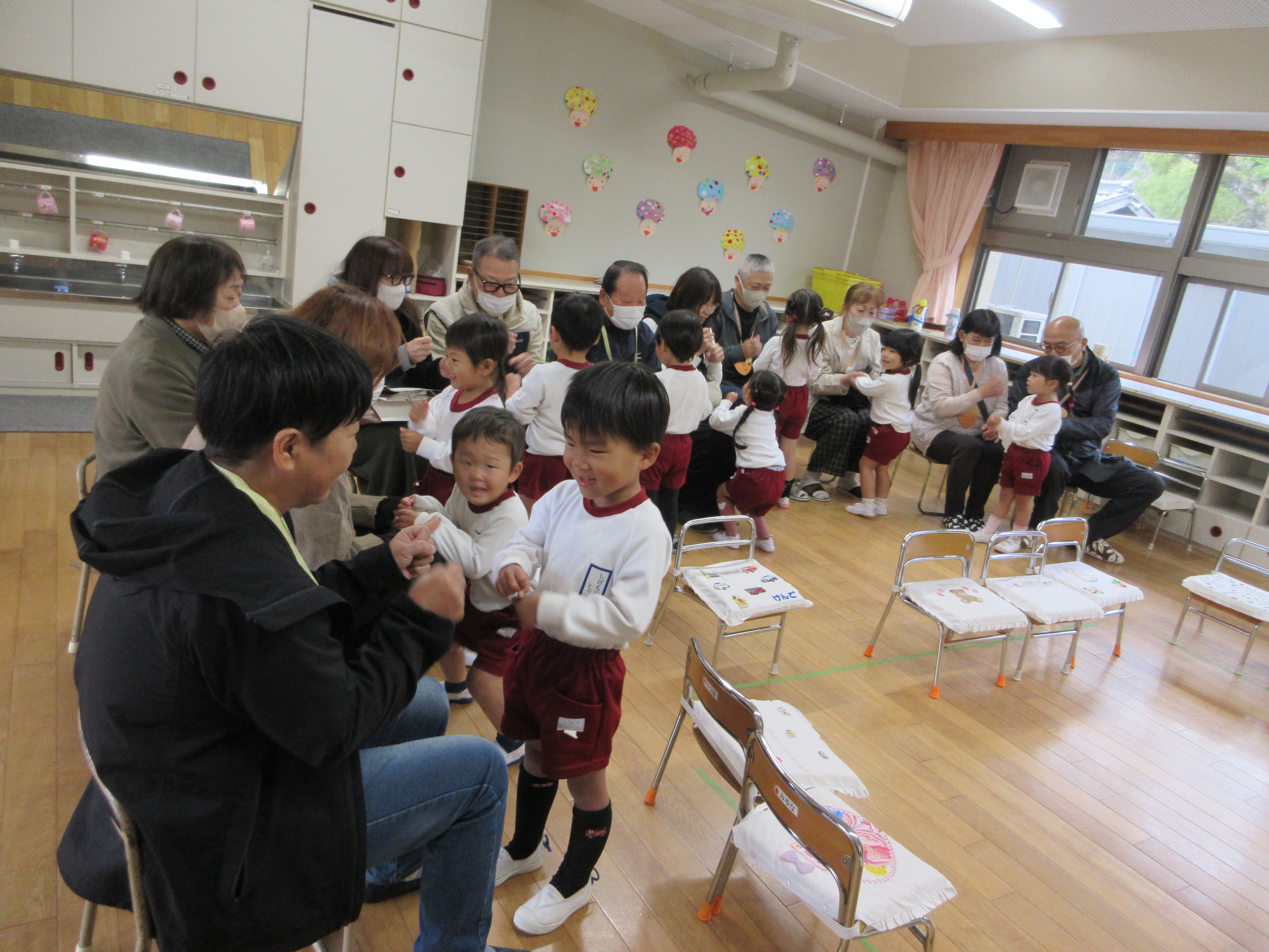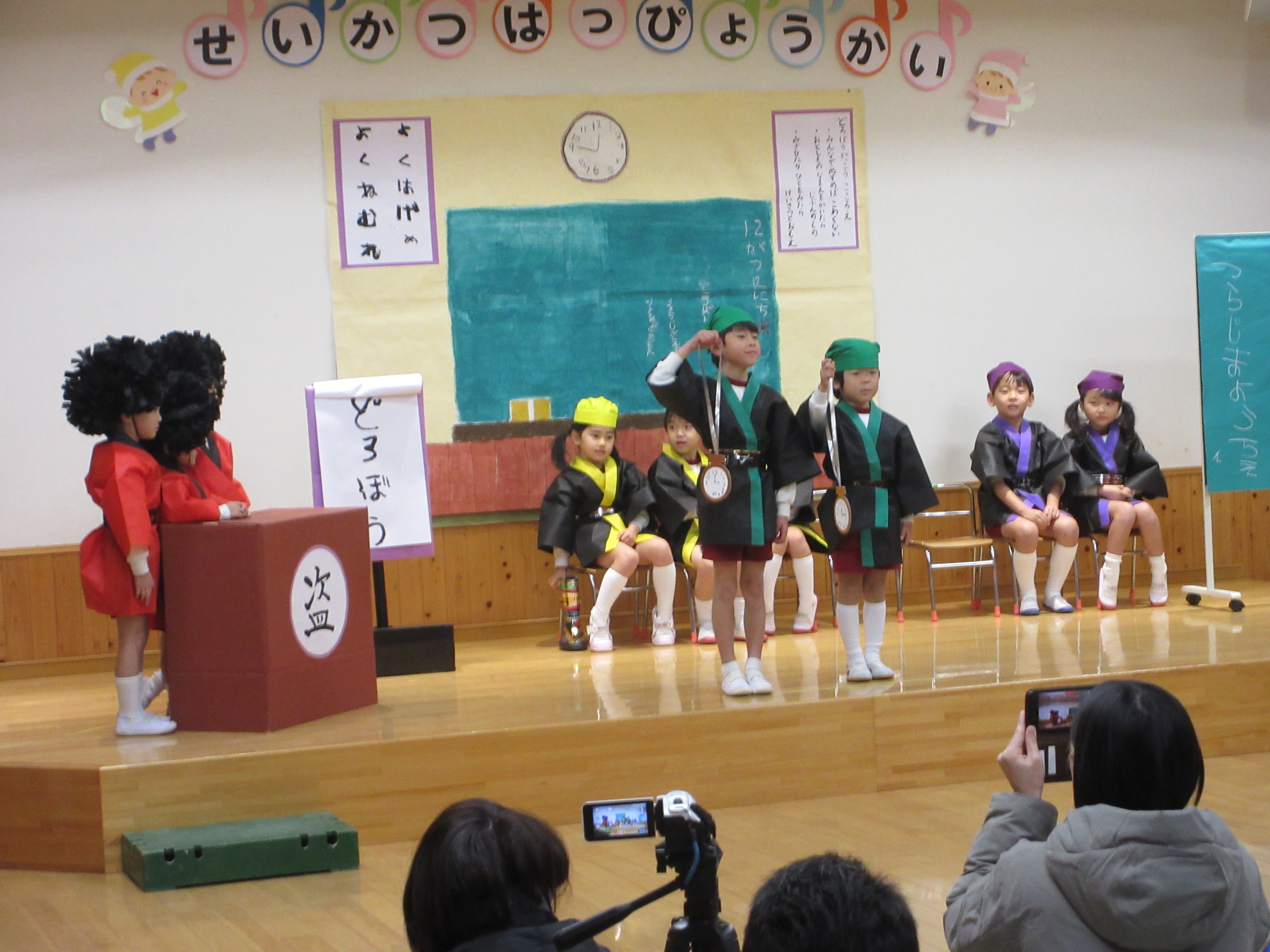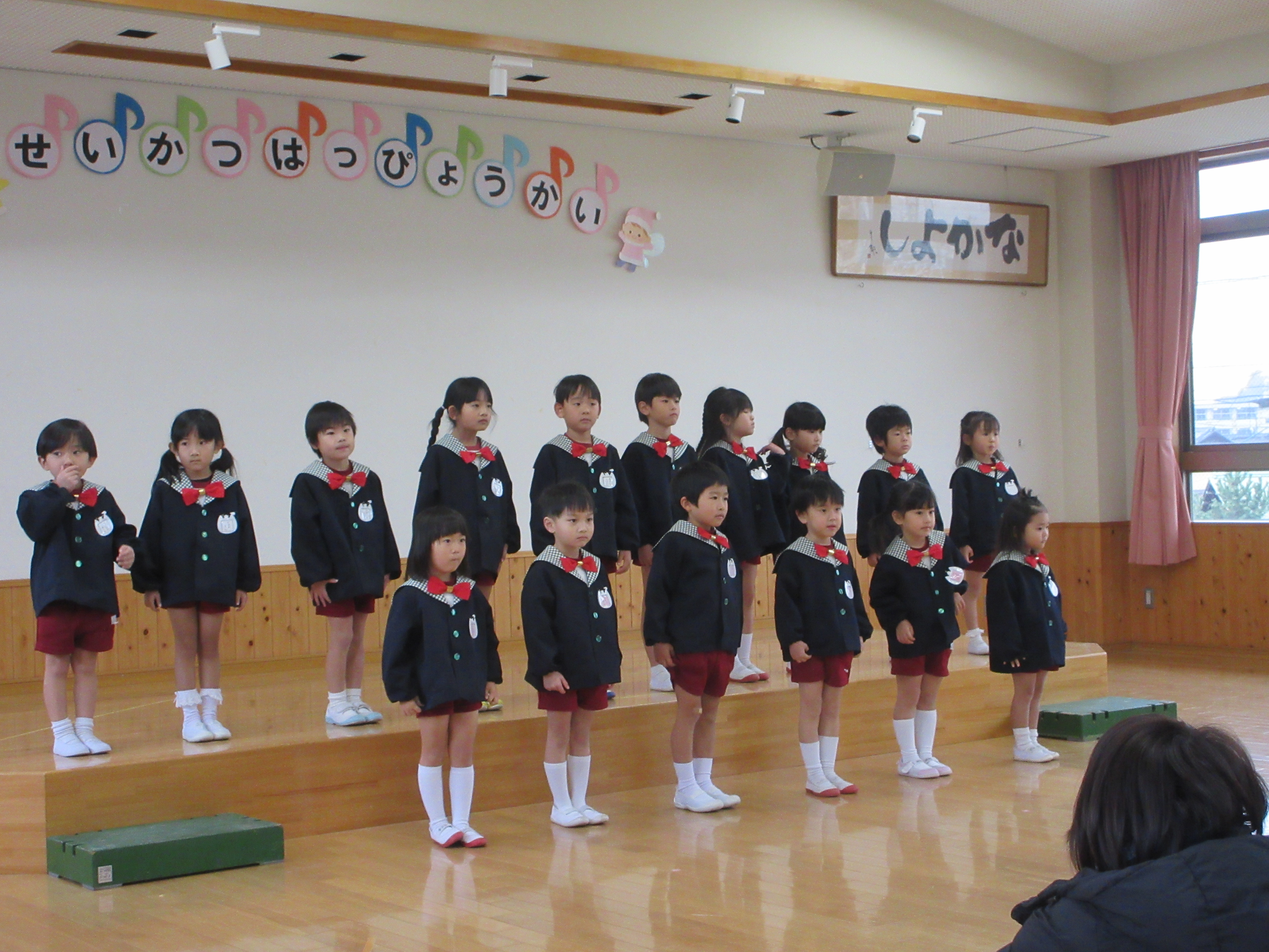 杵と臼でおもちができたよ サンタさんが幼稚園に来てくれたよ 3 学 期たこあげおうちの人と一緒につくった たこが天高くあがったよ! と ん ど 祭 り お飾りや書初めを燃やして元気に過ごせるようにお願いしたよ 豆 ま き 豆を投げて鬼を追い払ったあと、福の神がおひねりを持ってきてくれたよ! 生 活 発 表 会(ひよこ組)