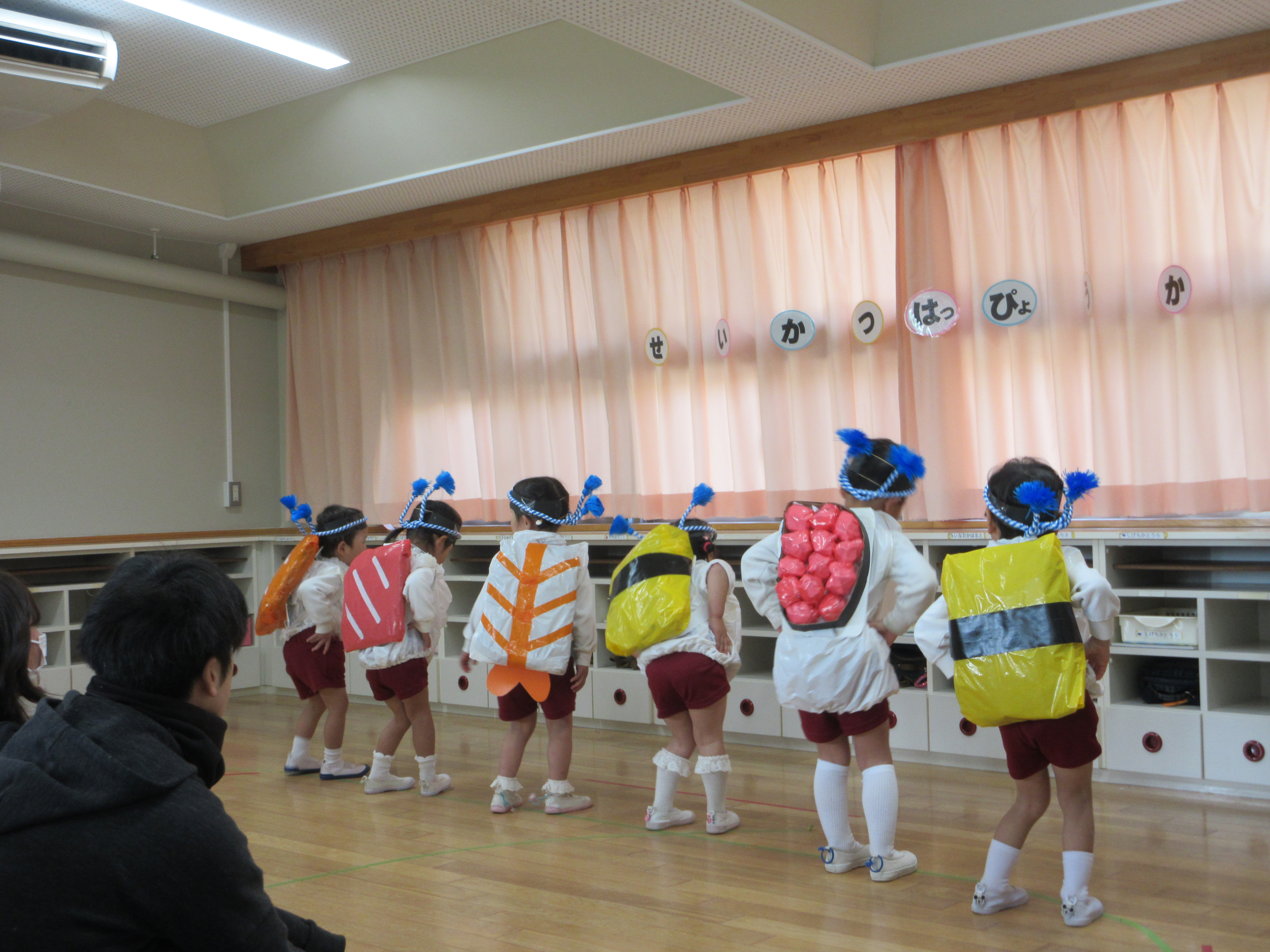 杵と臼でおもちができたよ サンタさんが幼稚園に来てくれたよ 3 学 期たこあげおうちの人と一緒につくった たこが天高くあがったよ! と ん ど 祭 り お飾りや書初めを燃やして元気に過ごせるようにお願いしたよ 豆 ま き 豆を投げて鬼を追い払ったあと、福の神がヒイラギイワシを持ってきてくれたよ! 生 活 発 表 会(ひよこ組)
